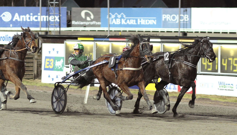 Finans Vendil tog sig efter lite kamp om positionerna till tät och stannade där hela vägen hem. Trots att tempot hölls uppe under vägen visade han fin inställning och höll farten väldigt bra hela vägen över mål. Tränar gör Sofia Pihlgren och segern var värd 12 000kr. Körde till segern gjorde Magnus S Karlsson.